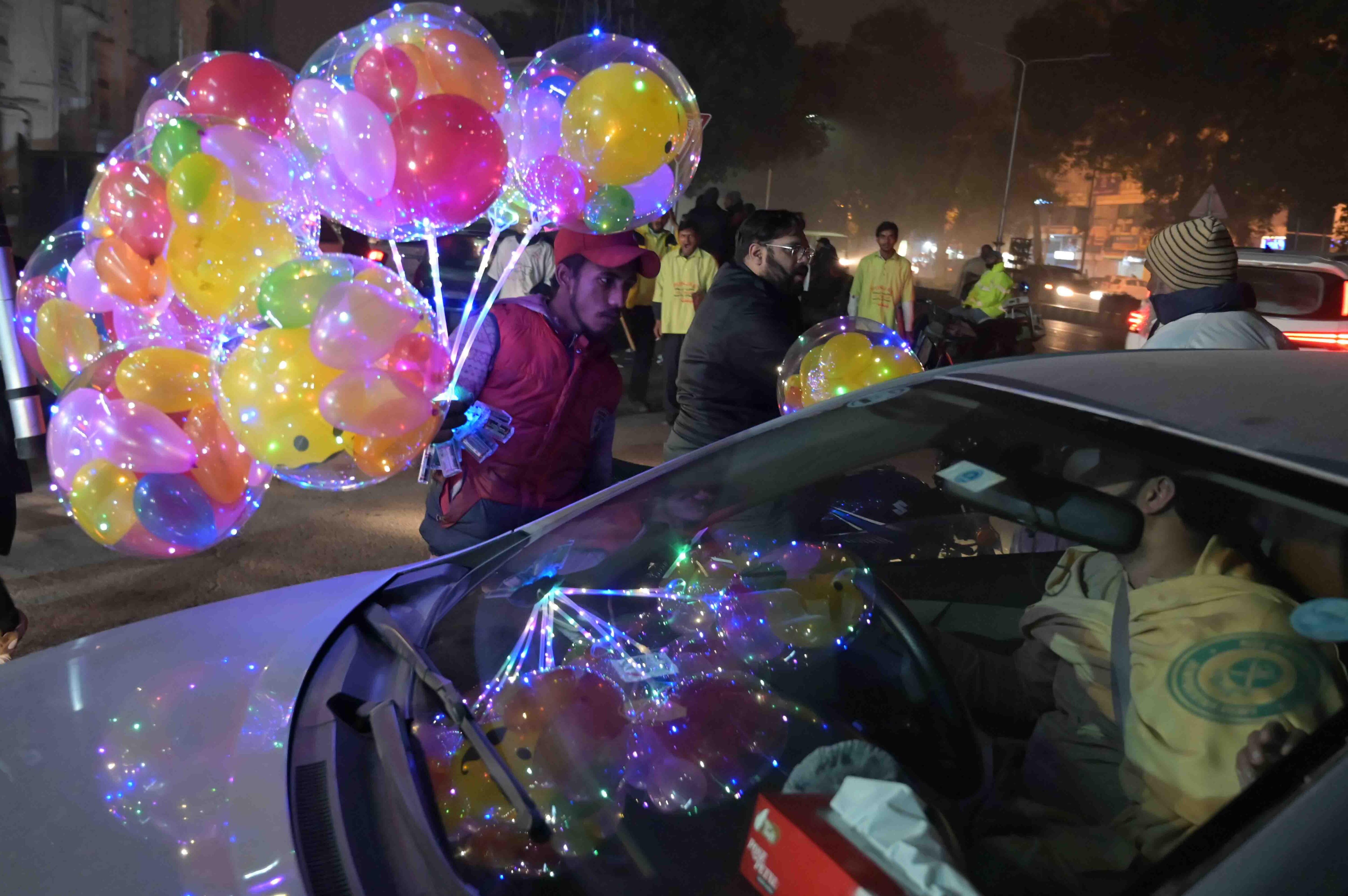 Lahore (Pakistan), 01/01/2025.- A man sells balloons on a street as people celebrate the New Year's Eve in Lahore, Pakistan, 01 January 2025. EFE/EPA/A. HUSSAIN / A. HUSSAIN