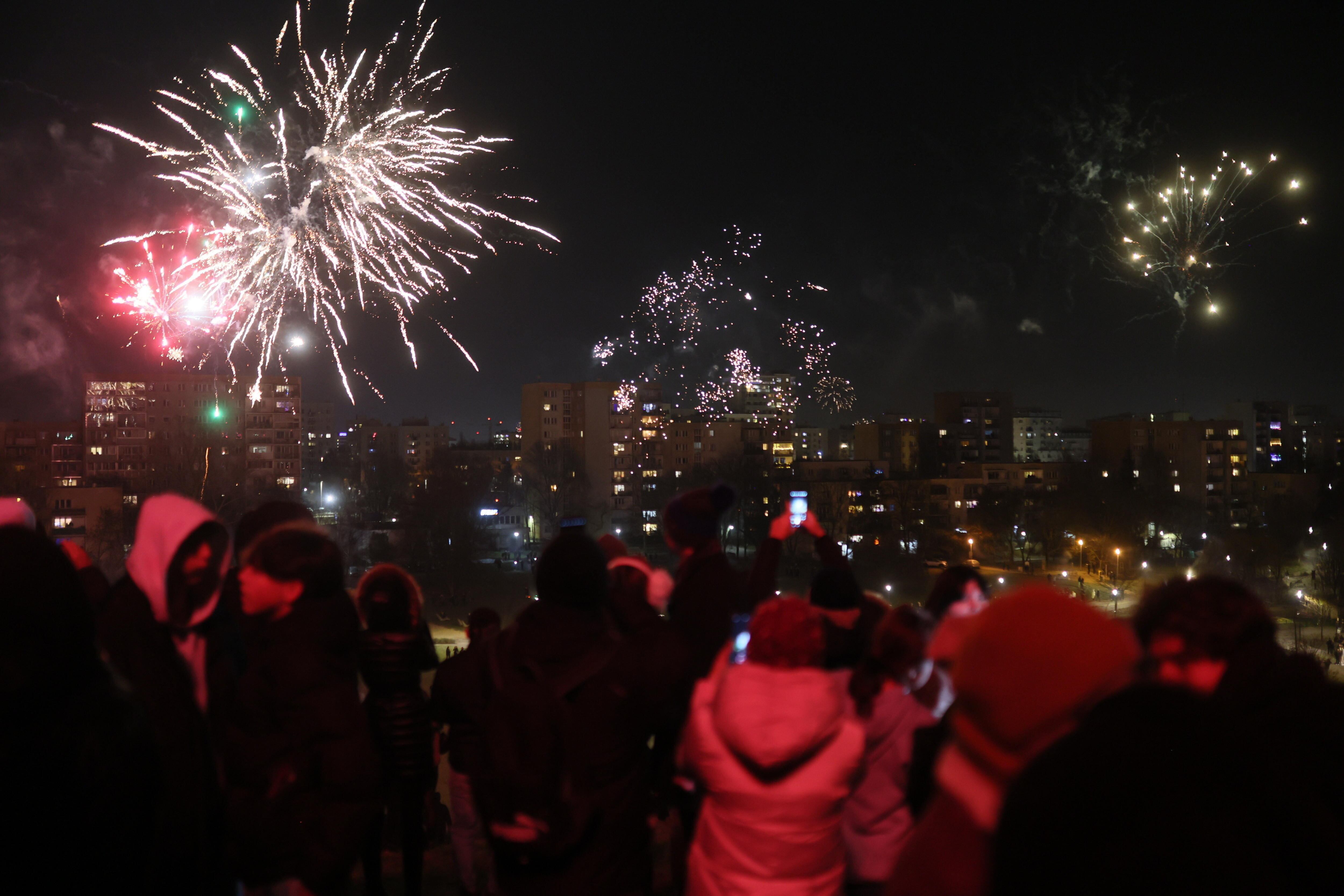 Warsaw (Poland), 01/01/2025.- Spectators watch a fireworks show prepared to welcome the New Year, on the Cwil's Mound in Warsaw, Poland, 01 January 2025. (Polonia, Varsovia) EFE/EPA/Leszek Szymanski POLAND OUT / Leszek Szymanski