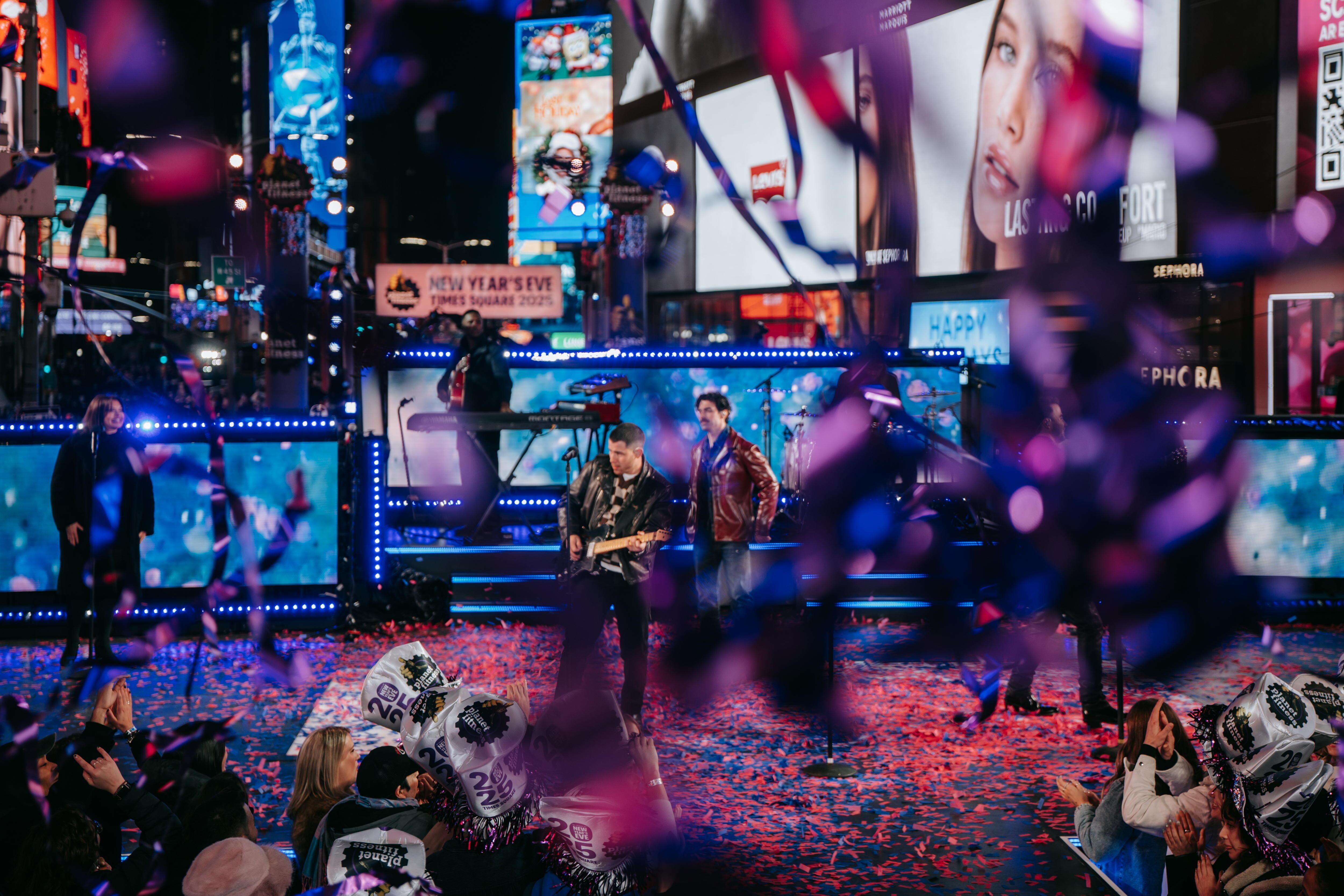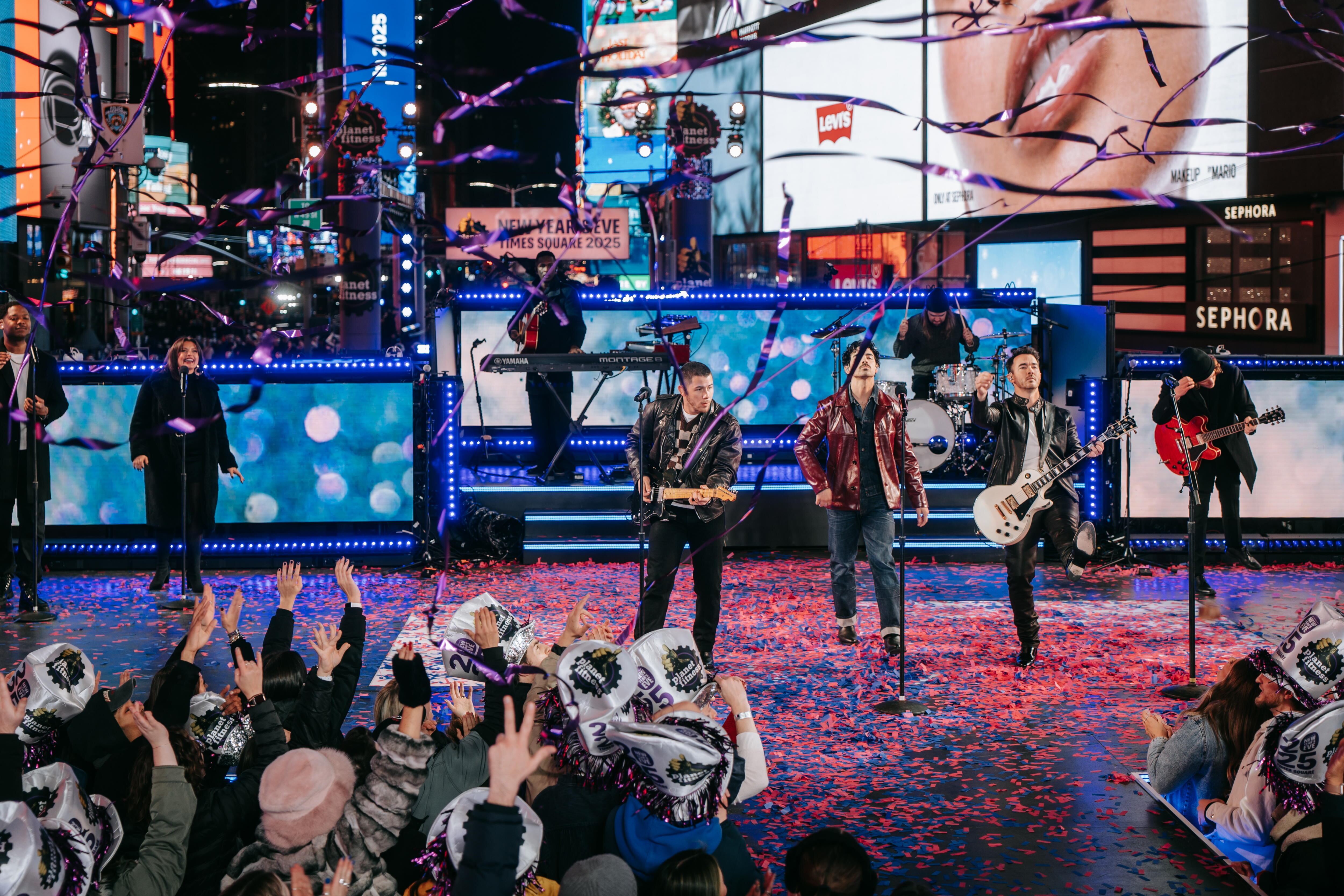 New York (United States), 01/01/2025.- American pop band Jonas Brothers performs ahead of the annual ball drop as revelers gather to celebrate the new year in Times Square on New Year's Eve in New York, New York, USA, 31 December 2024. (Nueva York) EFE/EPA/OLGA FEDEROVA / OLGA FEDEROVA