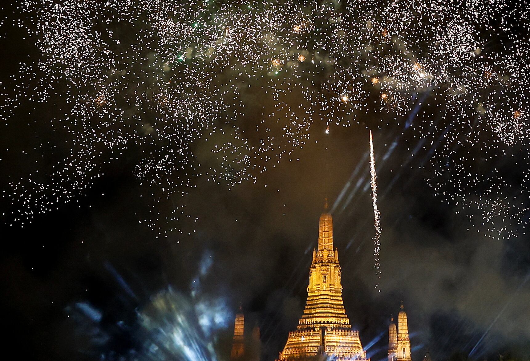 Bangkok (Thailand), 01/01/2025.- Fireworks and lights illuminate the sky over the pagoda of the Temple of Dawn or Wat Arun, as part of New Year's celebrations, in Bangkok, Thailand, 01 January 2025. (Tailandia) EFE/EPA/NARONG SANGNAK / NARONG SANGNAK