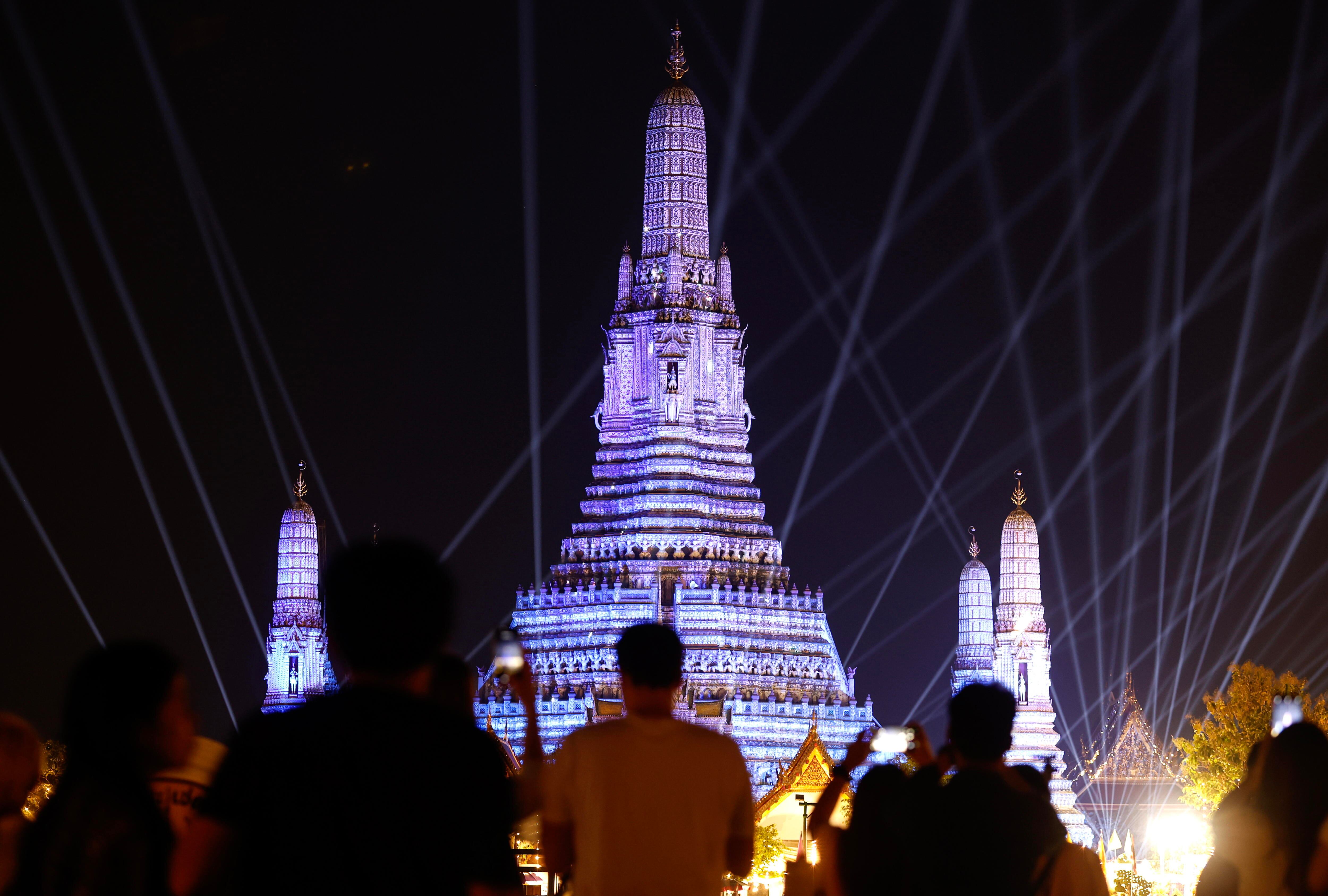 Bangkok (Thailand), 31/12/2024.- Revelers watch a light show around the pagoda of the Temple of Dawn or Wat Arun, illuminated as part of New Year's Eve celebrations, in Bangkok, Thailand, 31 December 2024. (Tailandia) EFE/EPA/NARONG SANGNAK / NARONG SANGNAK