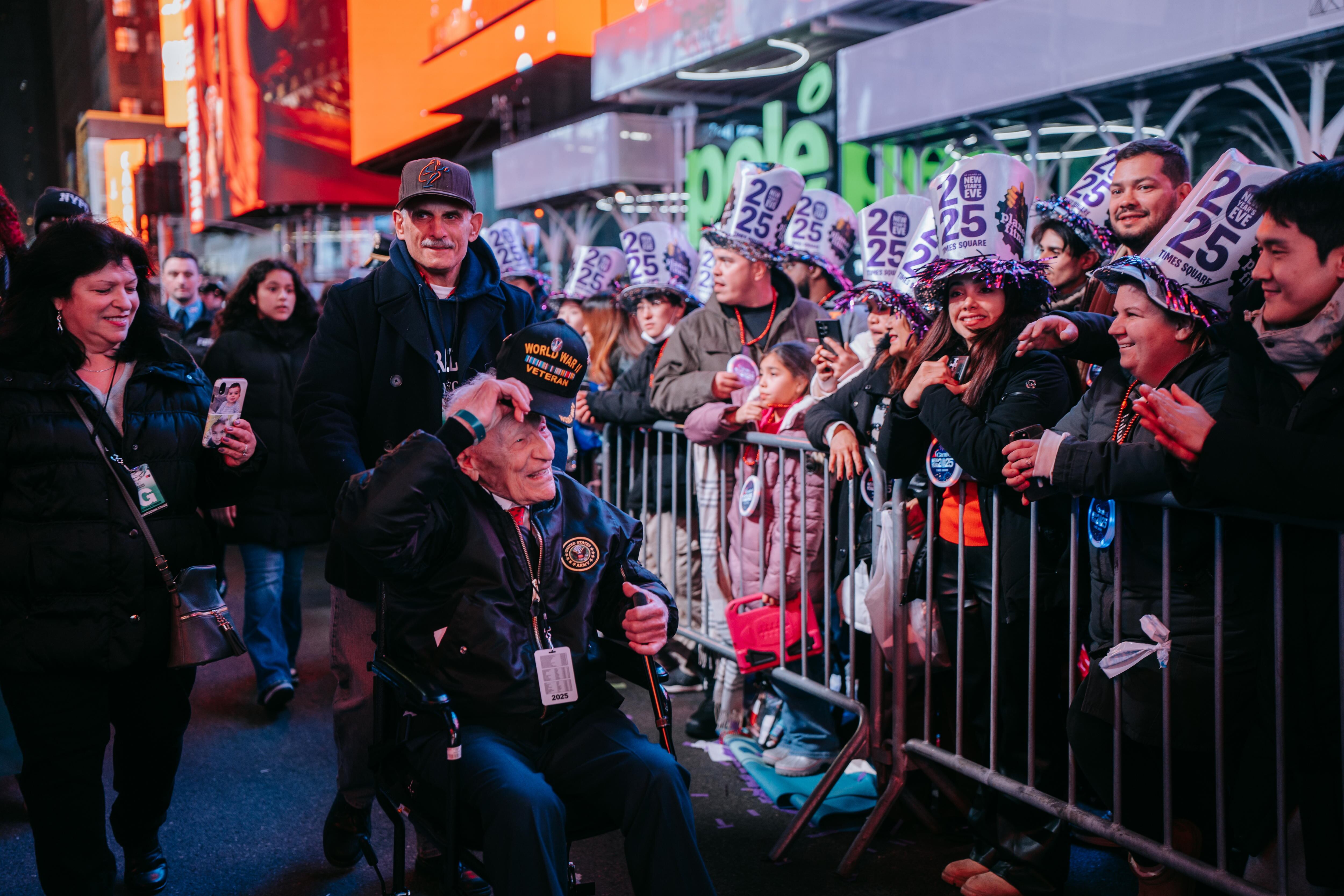 New York (United States), 01/01/2025.- People cheer for WWII veteran Dominick Cretelli, 103, ahead of the annual ball drop as revelers gather to celebrate the new year in Times Square on New Year's Eve in New York, New York, USA, 31 December 2024. (Nueva York) EFE/EPA/OLGA FEDEROVA / OLGA FEDEROVA
