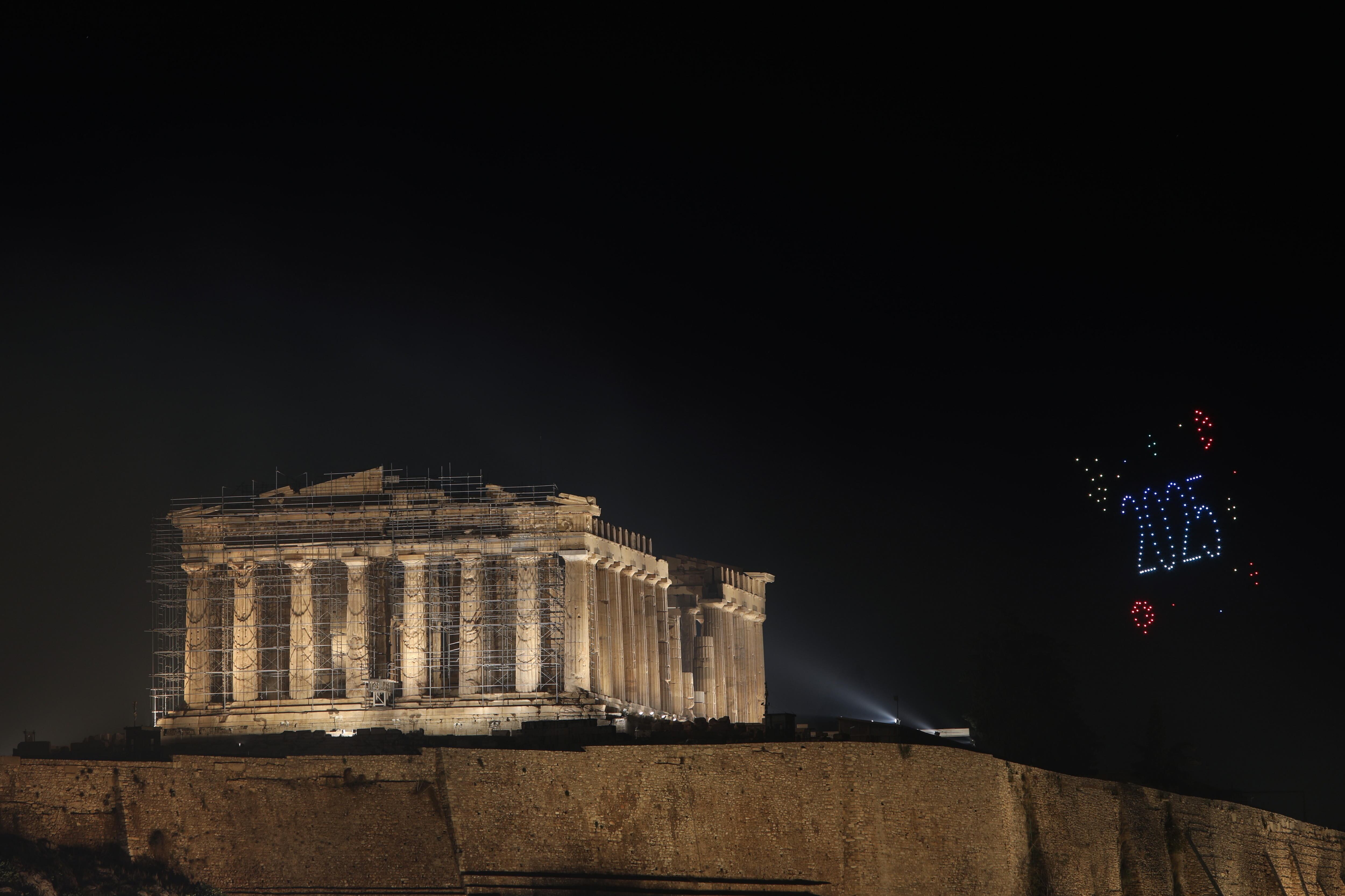 Athens (Poland), 01/01/2025.- A drone show illuminates the sky over the Parthenon on Acropolis Hill during New Year celebrations in Athens, Greece, 01 January 2025. (Grecia, Atenas) EFE/EPA/GEORGE VITSARAS / GEORGE VITSARAS