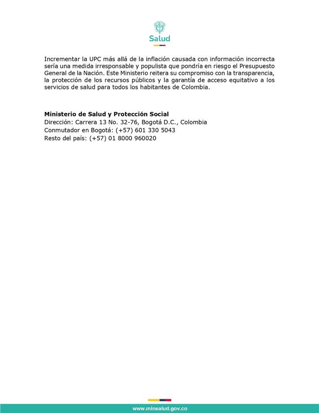 El Ministerio de Salud y Protección Social ajustó el valor de la Unidad de Pago por Capitación (UPC), amparándose en la inflación causada y señalando inconsistencias graves en los reportes de las EPS.