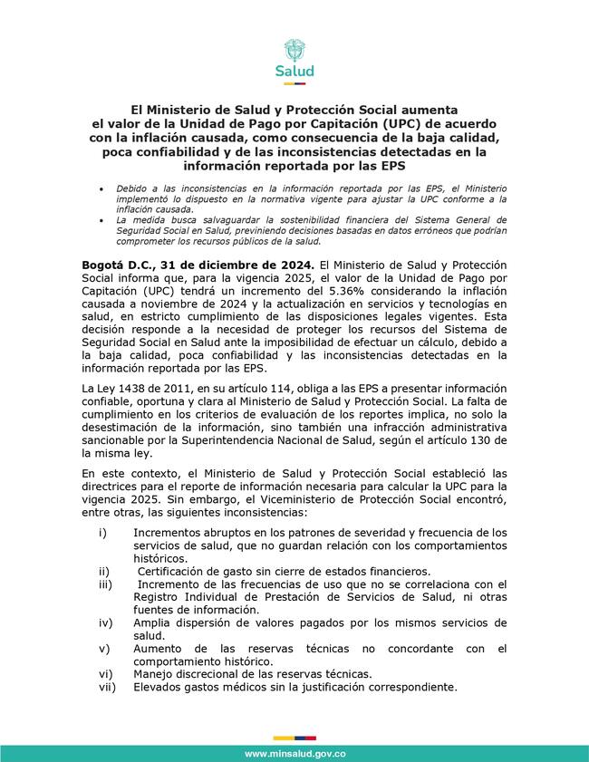 En un anuncio que ha generado reacciones encontradas, el Ministerio de Salud y Protección Social confirmó que el valor de la Unidad de Pago por Capitación (UPC) para 2025 aumentará un 5.36%, tomando como referencia la inflación causada a noviembre de 2024.