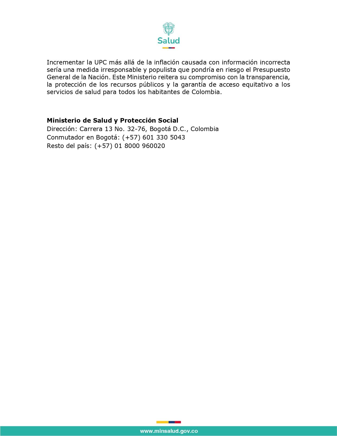 El Ministerio de Salud y Protección Social ajustó el valor de la Unidad de Pago por Capitación (UPC), amparándose en la inflación causada y señalando inconsistencias graves en los reportes de las EPS.