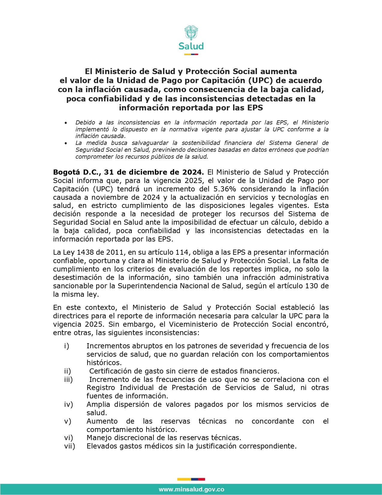 En un anuncio que ha generado reacciones encontradas, el Ministerio de Salud y Protección Social confirmó que el valor de la Unidad de Pago por Capitación (UPC) para 2025 aumentará un 5.36%, tomando como referencia la inflación causada a noviembre de 2024.