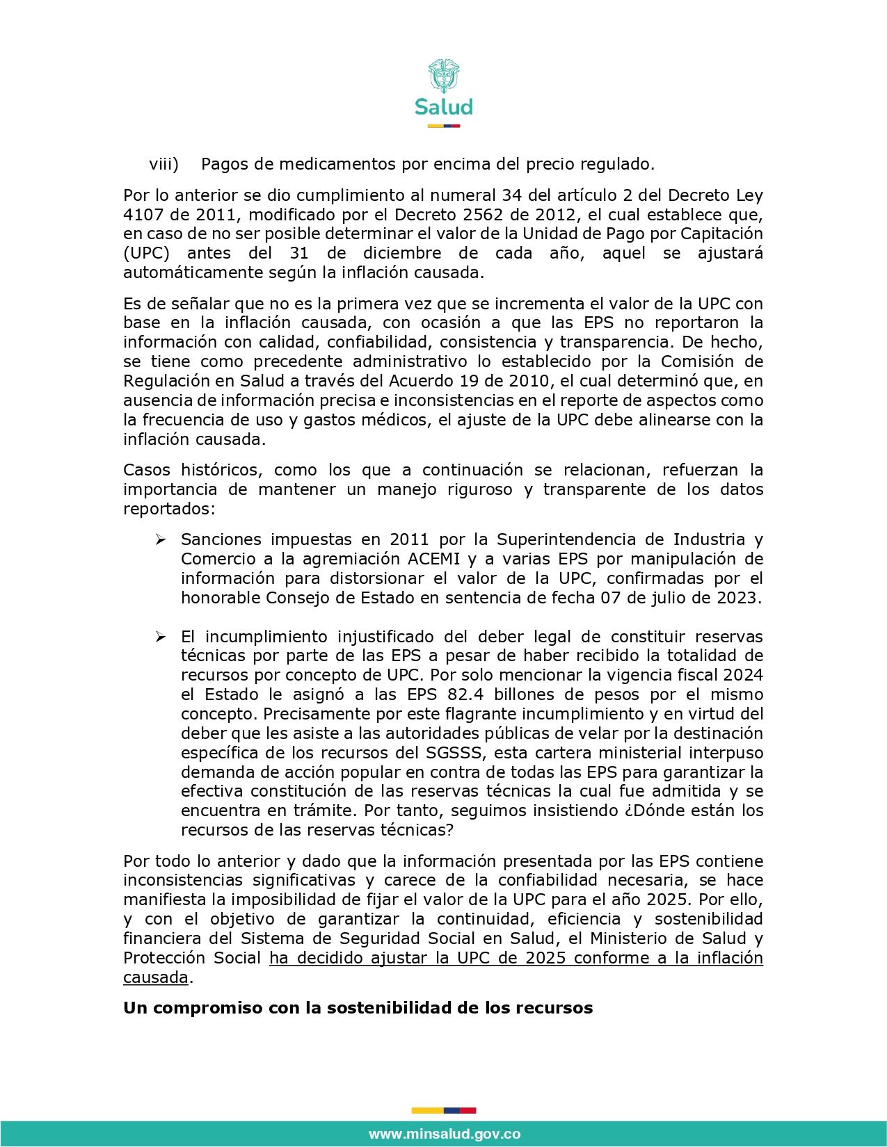 Según el comunicado oficial del Ministerio, el ajuste responde a inconsistencias graves detectadas en los reportes de las EPS, que dificultaron un cálculo más preciso. Entre las irregularidades mencionadas se encuentran aumentos abruptos en la frecuencia y severidad de los servicios, certificaciones de gasto sin soporte financiero y pagos por encima de precios regulados.