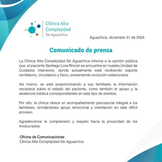 La Clínica Alta Complejidad de Aguachica informó que Santiago Lora, único sobreviviente de la tragedia que acabó con la vida de su familia, permanece bajo estricta supervisión médica en la Unidad de Cuidados Intensivos.