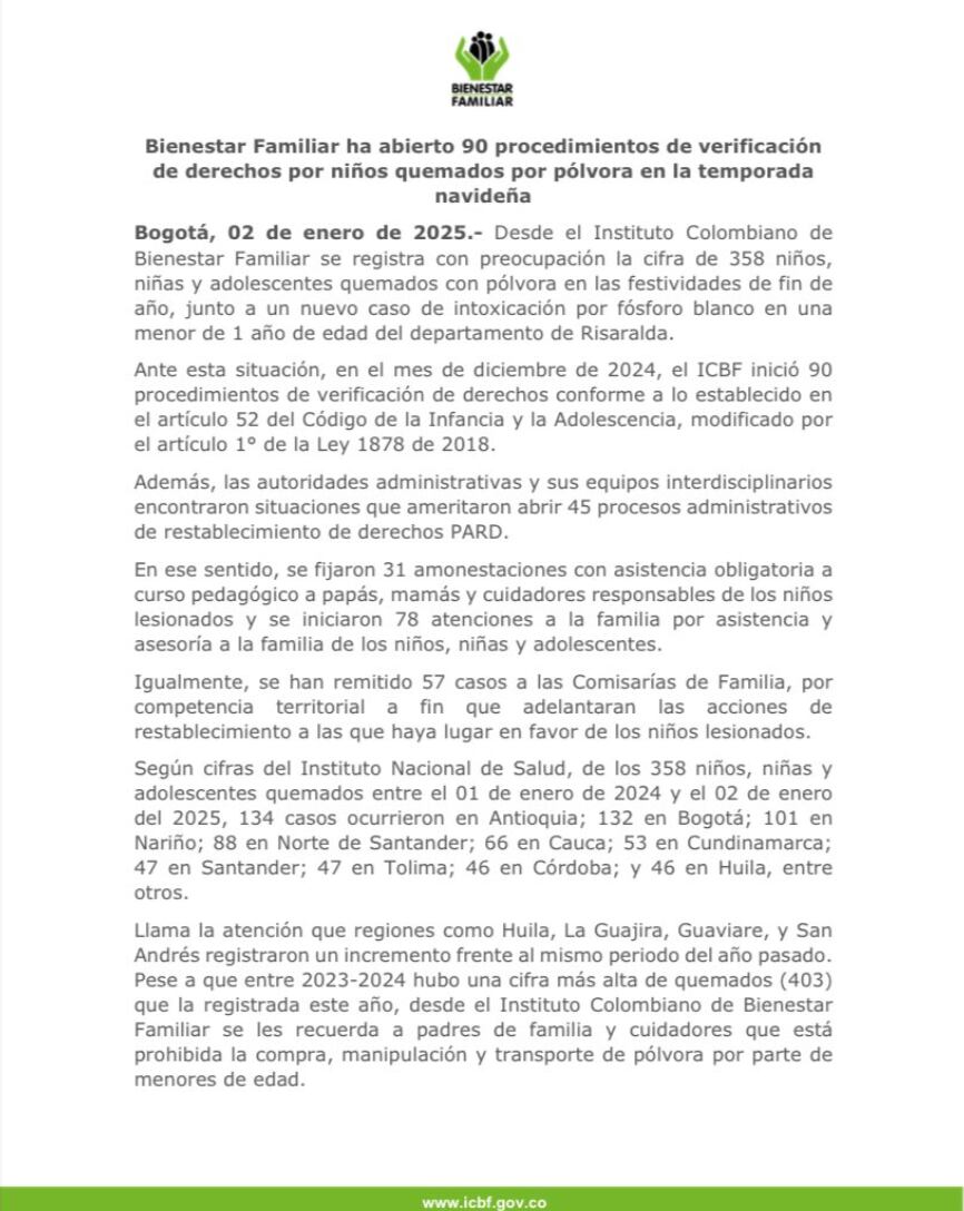 El ICBF reitera que está prohibida la compra, manipulación y transporte de pólvora por parte de menores y enfatiza la necesidad de buscar atención médica inmediata ante cualquier incidente. Los ciudadanos pueden reportar emergencias o incidentes relacionados a la línea 018000918080.