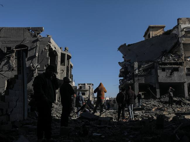 Al Maghazi Refugee Camp (---), 03/01/2025.- Palestinians inspect the destroyed house of the Abu Libda family following an Israeli air strike in Al Maghazi refugee camp, central Gaza Strip, 03 January 2025. According to reports from the Ministry of Health in Gaza at least nine members of the Abu Libda family were killed following an Israeli air strike in the refugee camp. More than 45,500 Palestinians and over 1,400 Israelis have been killed, according to the Palestinian Health Ministry and the Israeli Army, since Hamas militants launched an attack against Israel from the Gaza Strip on 07 October 2023 and the Israeli operations in Gaza and the West Bank that followed it. EFE/EPA/MOHAMMED SABER / MOHAMMED SABER (EFE)