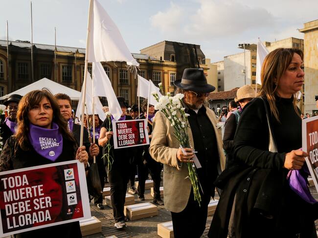 Bogotá. Febrero 20 de 2024. En la Plaza de Bolívar, el movimiento cívico Defendamos La Paz organizó un Duelo Colectivo para rendir homenaje a la memoria de 1408 líderes sociales y 416 excombatientes asesinados desde la firma del Acuerdo de Paz. (Colprensa - Mariano Vimos) / Mariano Vimos