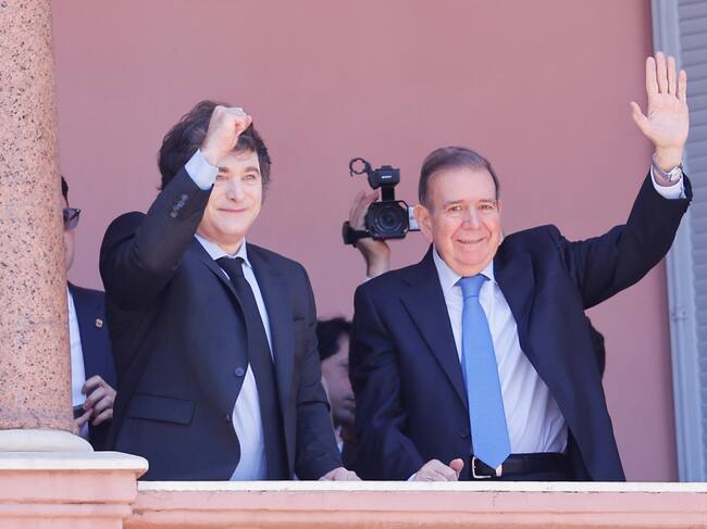 El presidente de Argentina, Javier Milei, y Edmundo González Urrutia salieron este sábado 4 de noviembre al balcón de la Casa Rosada para saludar a los miles de venezolanos congregados en la Plaza de Mayo de Buenos Aires, en la primera parada del líder opositor venezolano de una gira por varios países latinoamericanos.