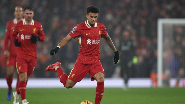 Liverpool (United Kingdom), 05/01/2025.- Liverpool's Luis Diaz (C) in action during the English Premier League match between Liverpool FC and Manchester United, in Liverpool, Britain, 05 January 2025. (Reino Unido) EFE/EPA/ADAM VAUGHAN EDITORIAL USE ONLY. No use with unauthorized audio, video, data, fixture lists, club/league logos, 'live' services or NFTs. Online in-match use limited to 120 images, no video emulation. No use in betting, games or single club/league/player publications. / ADAM VAUGHAN (EFE)