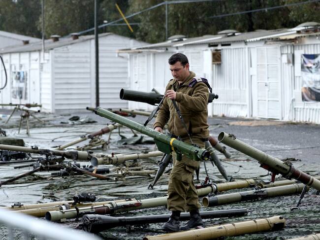 Amiad (Israel), 31/12/2024.- Un soldado israelí sostiene un arma militar expuesta a los medios de comunicación en el campamento militar de Amiad, en el norte de Israel. / ATEF SAFADI (EFE)