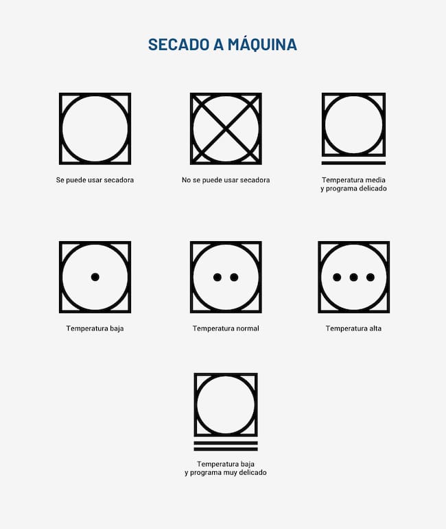 - Cuadrado con un círculo adentro: La prenda puede secarse en máquina y los puntos indican la temperatura: