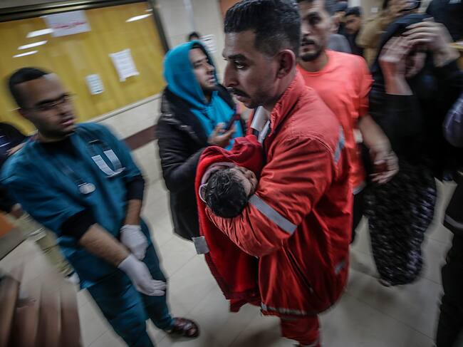 Ciudad de Deir Al Balah (---), 07/01/2025.- Un bebé palestino herido es trasladado al hospital Al Aqsa tras un ataque aéreo israelí contra el campo de refugiados de Al Bureije. / MOHAMMED SABER (EFE)