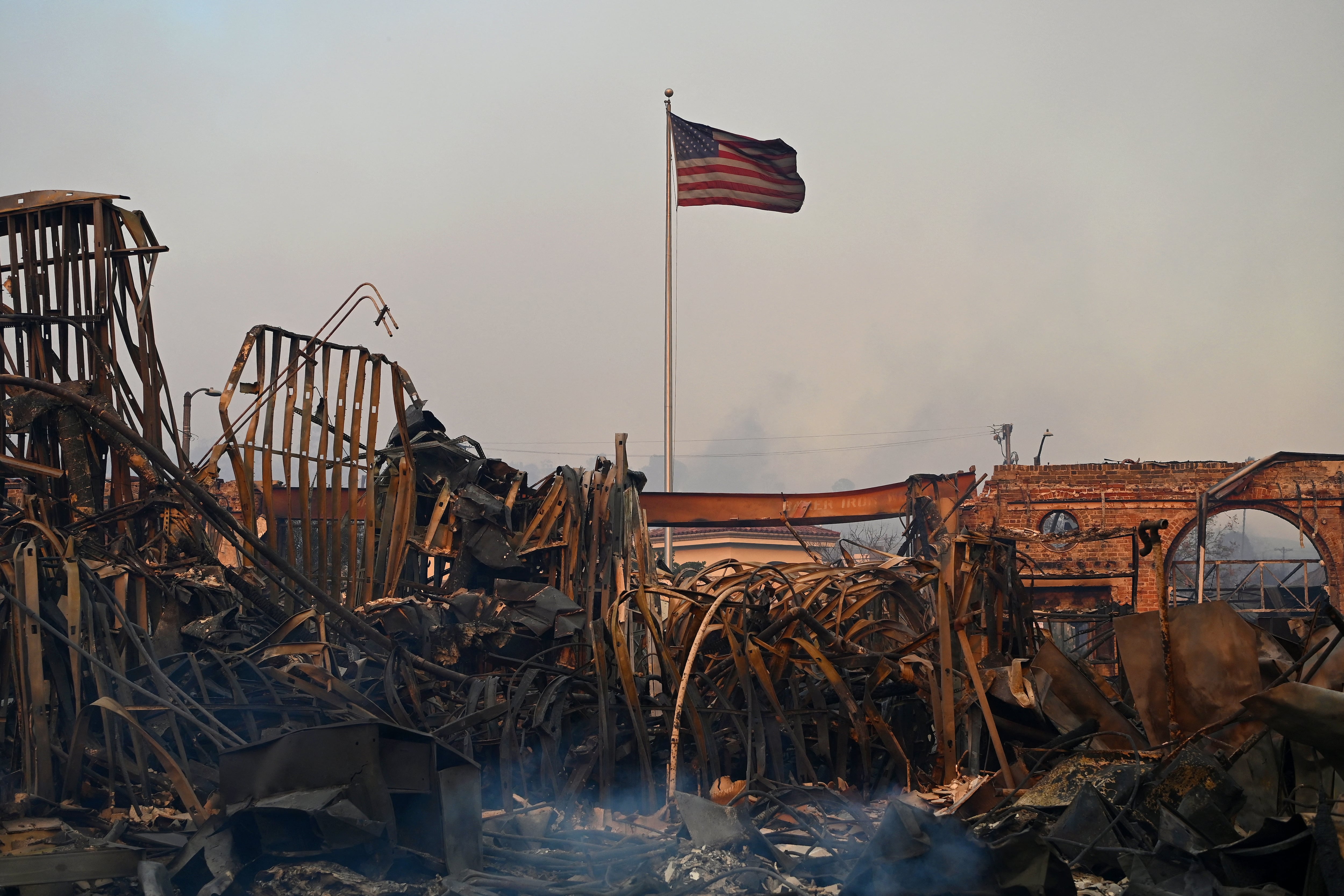 Una bandera estadounidense ennegrecida ondea sobre una estructura carbonizada tras el paso del incendio de Palisades, en Pacific Palisades, California, el 8 de enero de 2025. AFP / AGUSTIN PAULLIER
