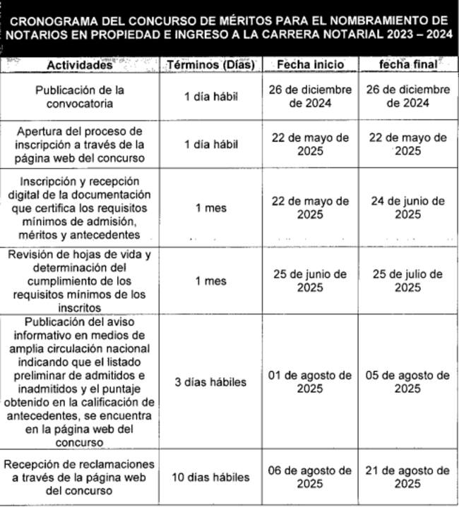 Cronograma del concurso de mérito para el nombramiento de notarios en propiedad e ingreso a la carrera notarial