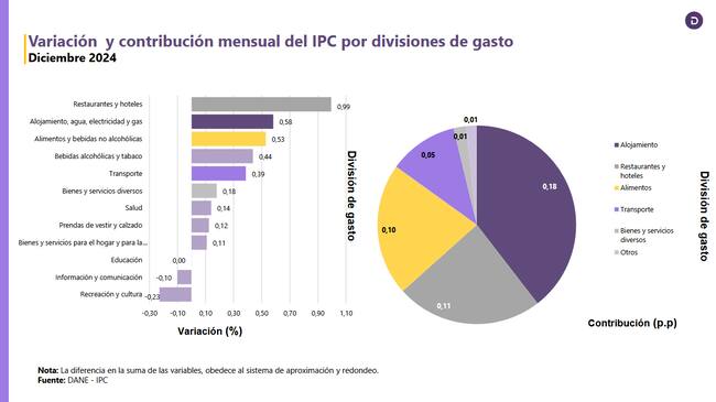 Por divisiones de gasto, en diciembre las que más contribuyeron para jalonar el costo de vida de los colombianos fueron: restaurantes y hoteles, debido a las comidas en la calle y los precios de las comidas preparadas; especialmente alojamiento, agua, electricidad y gas; alimentos y bebidas no alcohólicas, para esta división de gasto el precio del mango fue uno de los que jalonó la inflación, sumándose a que alimentos como las papas y los plátanos se estabilizaron y dejaron de descender en sus precios.