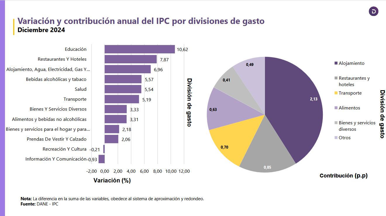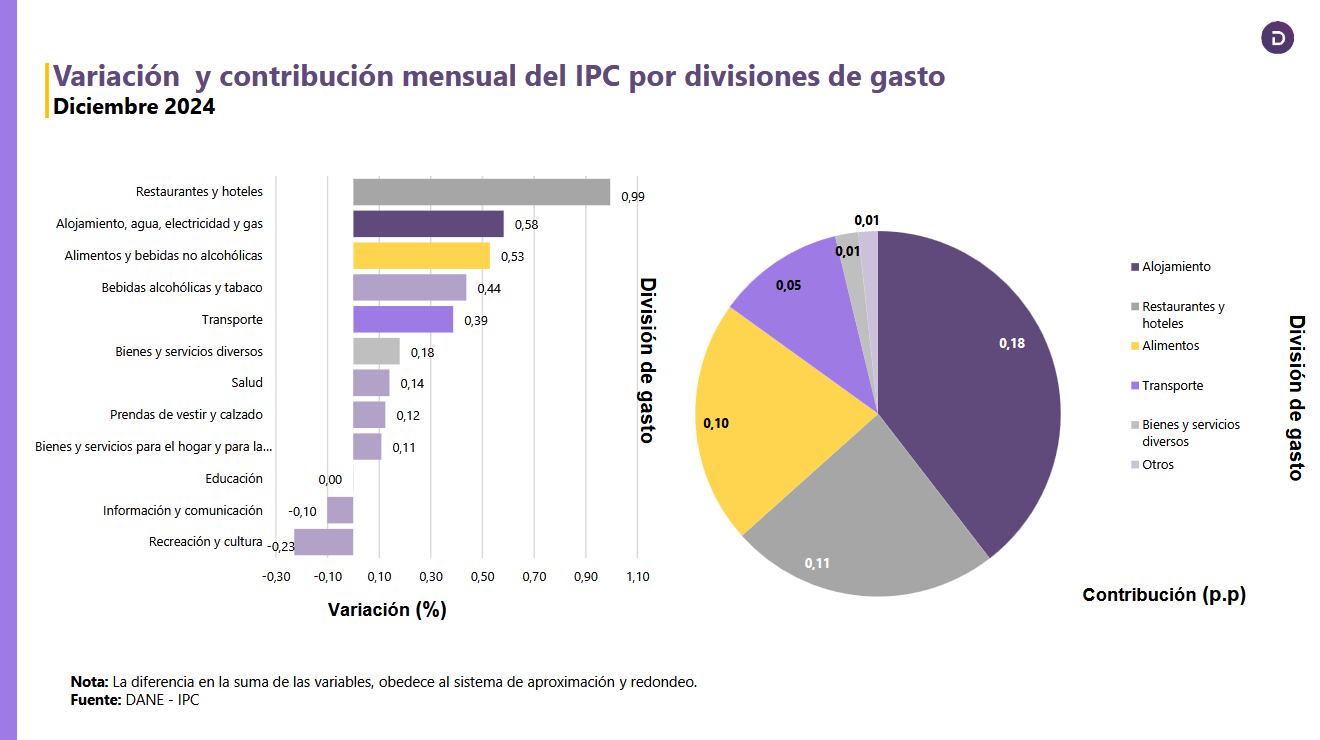 Por divisiones de gasto, en diciembre las que más contribuyeron para jalonar el costo de vida de los colombianos fueron: restaurantes y hoteles, debido a las comidas en la calle y los precios de las comidas preparadas; especialmente alojamiento, agua, electricidad y gas; alimentos y bebidas no alcohólicas, para esta división de gasto el precio del mango fue uno de los que jalonó la inflación, sumándose a que alimentos como las papas y los plátanos se estabilizaron y dejaron de descender en sus precios.