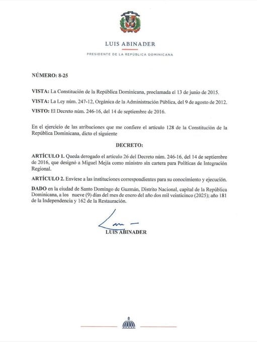 Por medio de un decreto, el presidente de República Dominicana, Luis Abinader, tomó la decisión de relevar del cargo a Miguel Mejía, quien fue el ministro de Integración Regional del país durante ocho años.