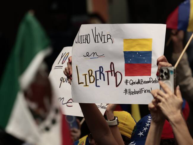 CIUDAD DE MÉXICO (MÉXICO), 09/01/2025.- Una persona venezolana sostiene un cartel en una manifestación este jueves frente a la embajada de Venezuela. / José Méndez (EFE)