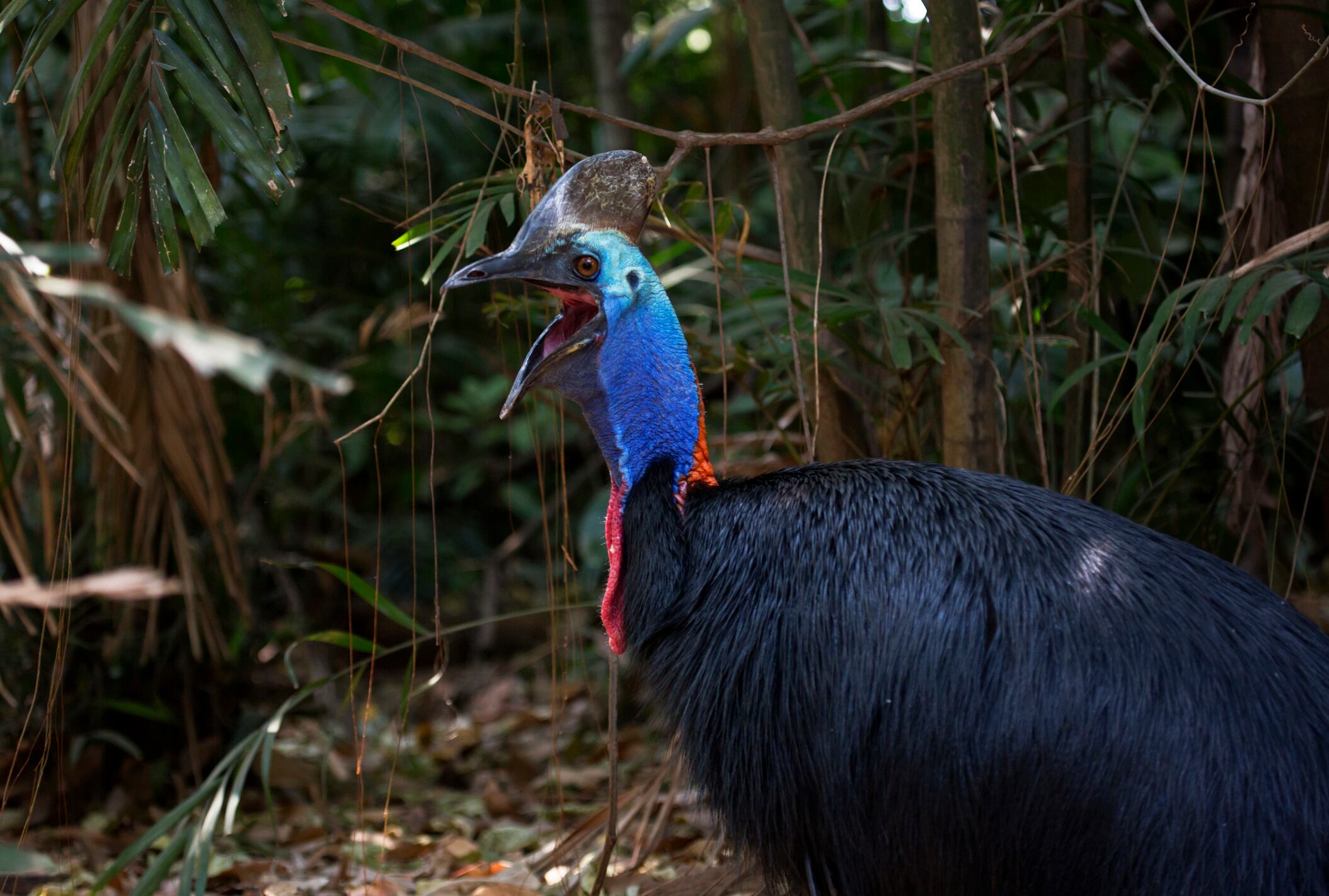 Aunque hay registros de que estos animales han atacado a los humanos, el ave no se alimenta de esta especie. “Es frugívora y, al no volar, se alimenta principalmente de fruta caída al suelo, así como de insectos, pequeños vertebrados como anfibios y reptiles (a los que ataca con sus garras), e incluso hongos”.
