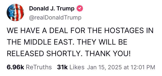 “Tenemos un acuerdo para los rehenes en Oriente Medio. Serán liberados en breve. ¡Gracias!”, declaró el republicano en su red Truth Social.