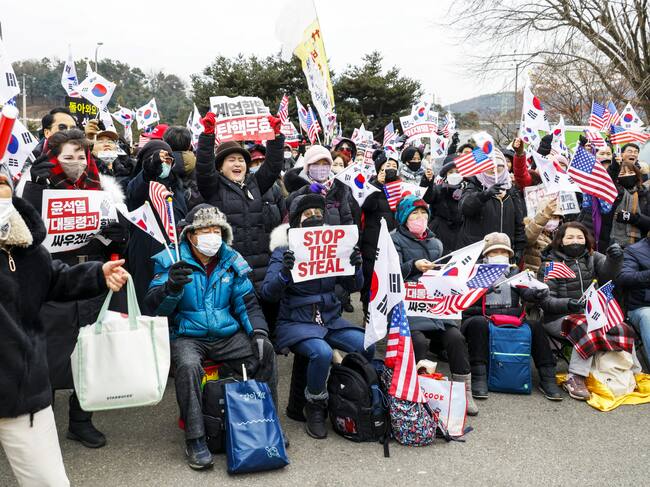 Uiwang (República de Corea), 15/01/2025.- Simpatizantes del destituido presidente surcoreano Yoon Suk Yeol se concentran ante el centro de detención de Seúl, donde se encuentra recluido. / JEON HEON-KYUN (EFE)