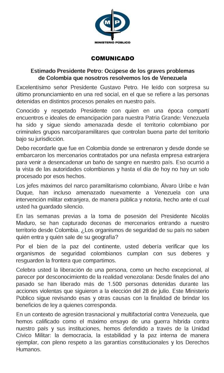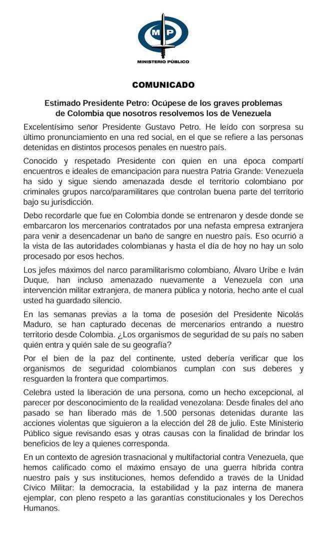 Fiscal de Venezuela pidió a Petro no meterse en problemas internos del país: “ocúpese de Colombia”