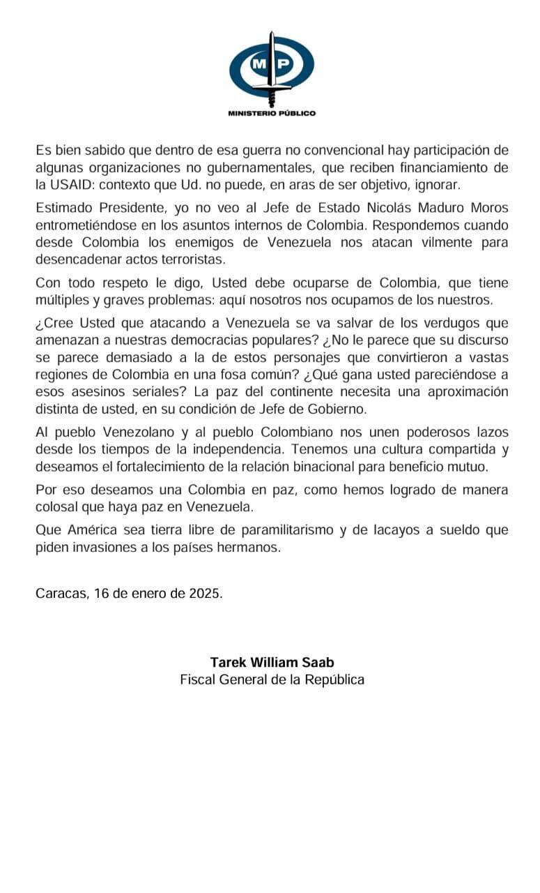 El fiscal general de Venezuela, Tarek William Saab, le pidió este jueves 16 de enero al presidente de Colombia, Gustavo Petro, no inmiscuirse en los problemas internos del país caribeño y ocuparse de la nación que gobierna, luego de que el mandatario celebrara la excarcelación del director de la ONG Espacio Público, Carlos Correa.