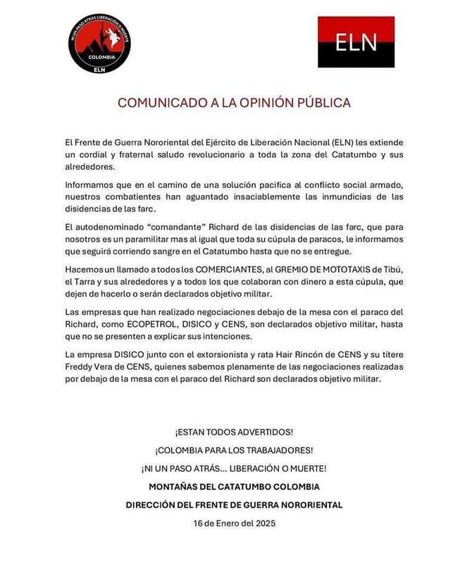El comunicado hizo un llamado específico a comerciantes, mototaxistas y empresas locales, instándolos a cesar cualquier apoyo financiero a las disidencias de las Farc, bajo la pena de ser declarados objetivos militares. “Las empresas que han realizado negociaciones debajo de la mesa con el paraco del Richard son declaradas objetivo militar hasta que no se presenten a explicar sus intenciones”, señaló el ELN, mencionando directamente a empresas como Ecopetrol, Disico y CENS, así como a individuos vinculados a estas entidades.