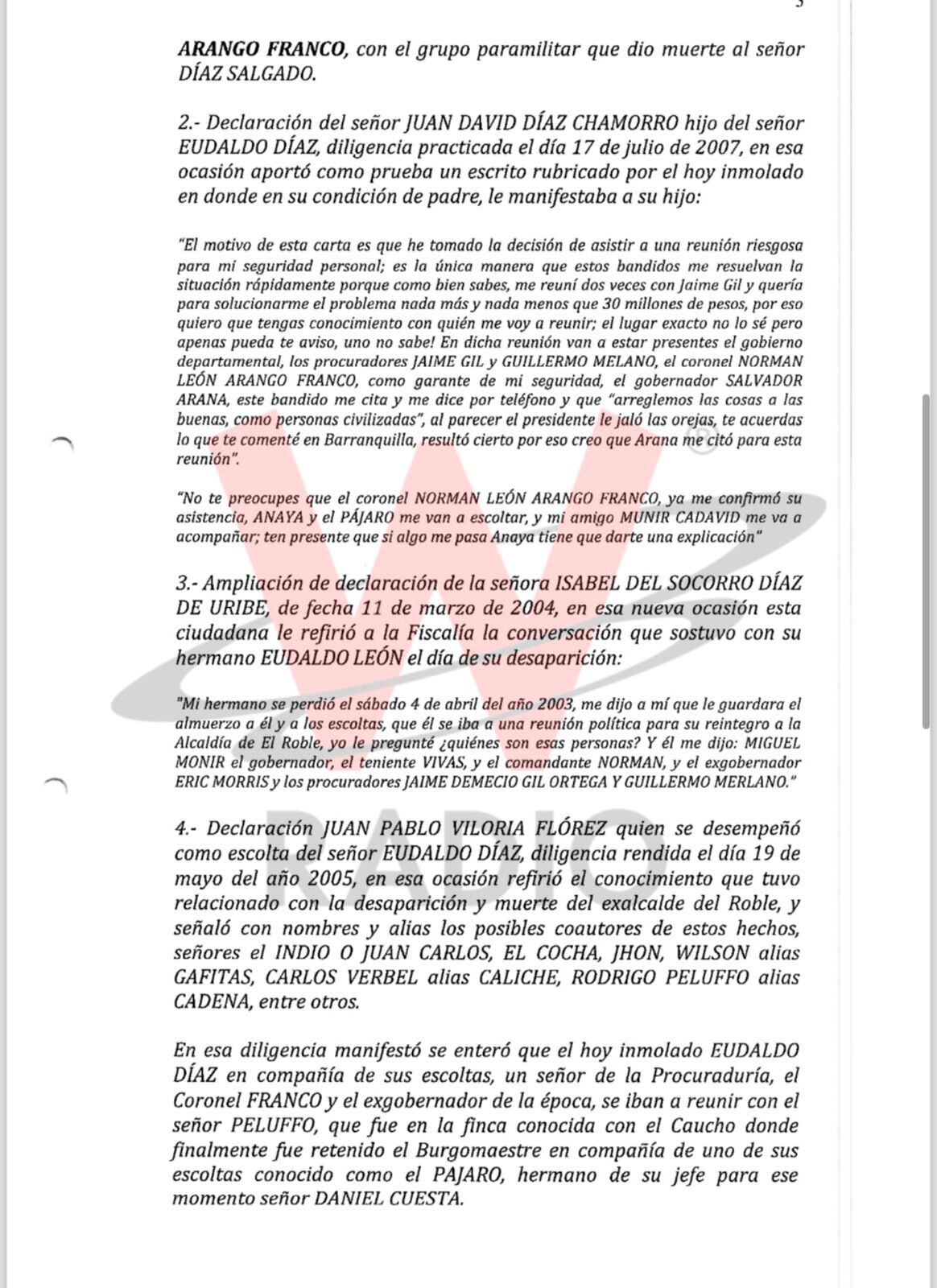 El motivo de esta carta es que he tomado la decisión de asistir a una reunión riesgosa para mi seguridad personal; es la única manera en que estos bandidos me resuelvan la situación rápidamente porque, como bien sabes, me reuní dos veces con Jaime Gil y quería para solucionarme el problema nada más y nada menos que 30 millones de pesos. Por eso quiero que tengas conocimiento con quién me voy a reunir; el lugar exacto no lo sé, pero apenas pueda te aviso, ¡uno no sabe! En dicha reunión van a estar presentes el gobierno departamental, los procuradores JAIME GIL y GUILLERMO MELANO, el coronel NORMAN LEÓN ARANGO FRANCO, como garante de mi seguridad, el gobernador SALVADOR ARANA; este bandido me cita y me dice por teléfono que “arreglemos las cosas a las buenas, como personas civilizadas”. Al parecer, el presidente le jaló las orejas. ¿Te acuerdas de lo que te comenté en Barranquilla? Resultó cierto, por eso creo que Arana me citó para esta reunión".