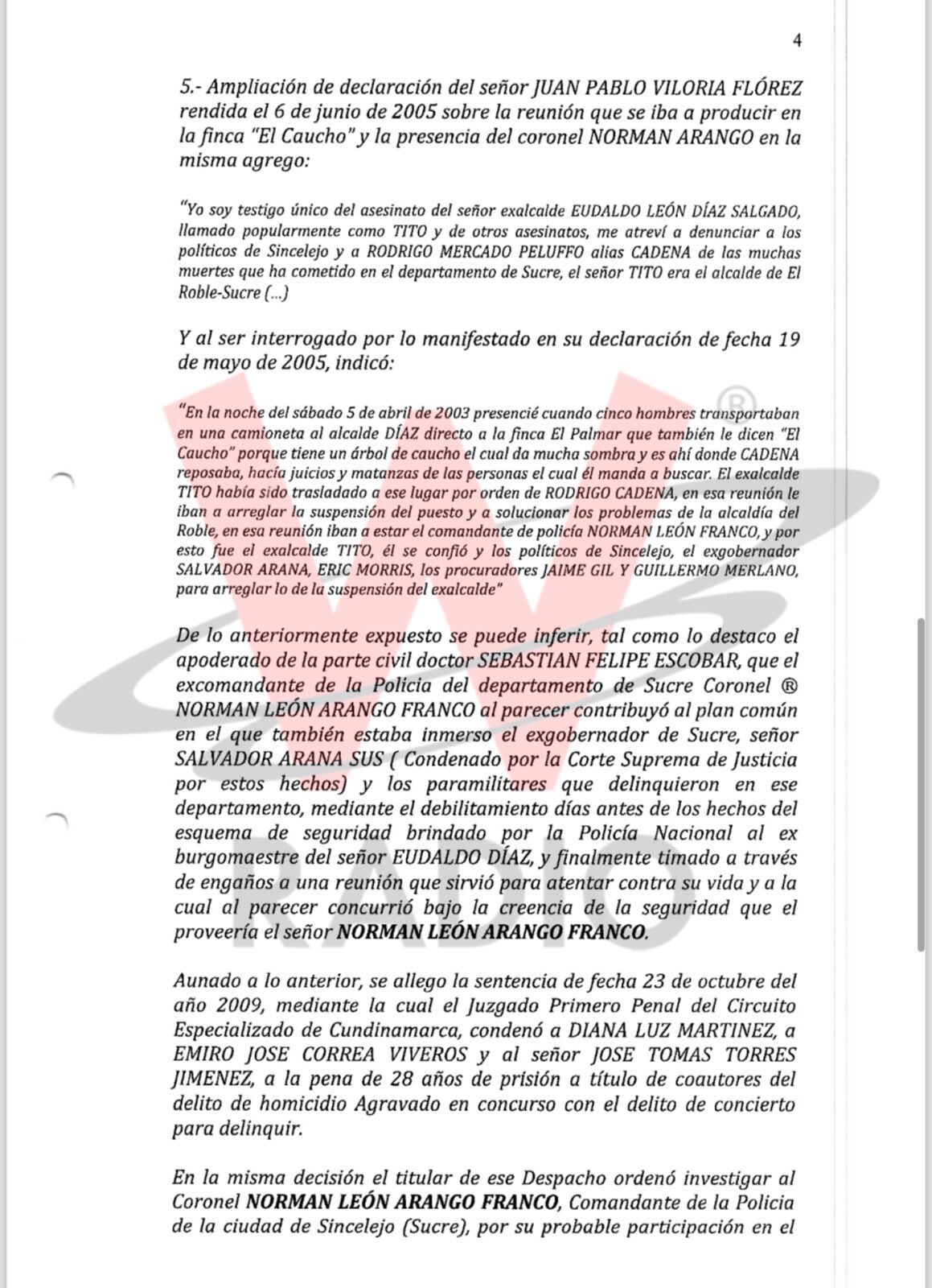 La Fiscalía tomó la decisión basada en las declaraciones de los testigos que advierten que el exalcalde Eduardo León Díaz Salgado acudió a una reunión a la que había sido citado por Rodrigo Mercado Peluffo alias ‘Cadena’ (según un documento que aportó la familia Díaz, la reunión era realmente con Salvador Arana quien ordenó matarlo), a la cual decidió asistir porque el entonces coronel Norman León Arango Franco le había garantizado no solo que asistiría a dicho encuentro, sino que contaría con seguridad.