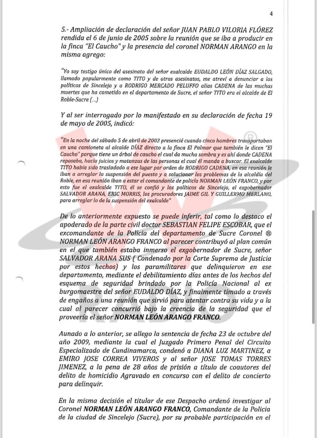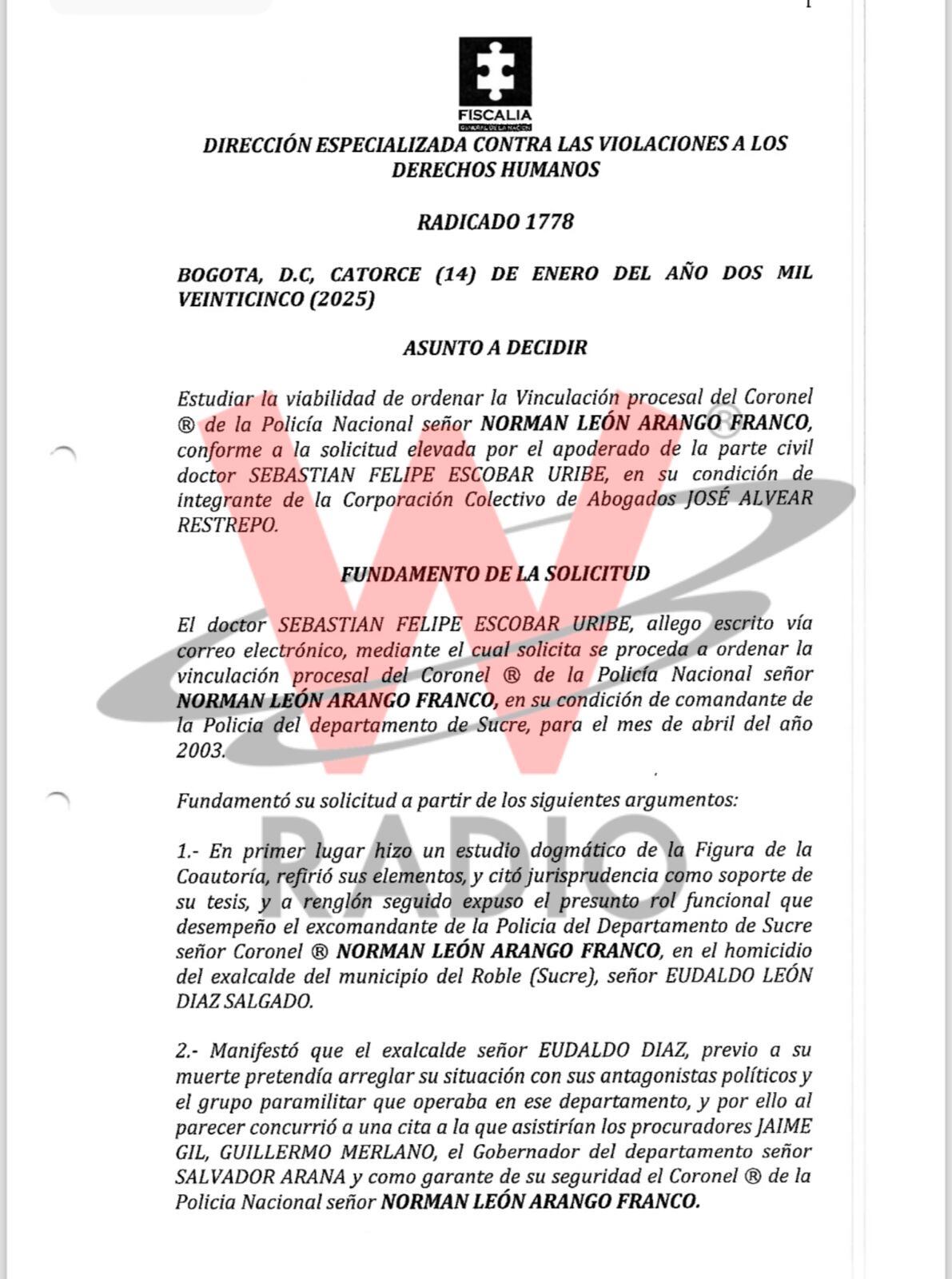 W Radio conoció en primicia que la Fiscalía General de la Nación vinculó formalmente al coronel retirado Norman León Arango Franco, excomandante de la Policía de Sucre (abril 2003), a la investigación por la desaparición forzada y el homicidio del exalcalde del Roble Edualdo León Díaz Salgado.
