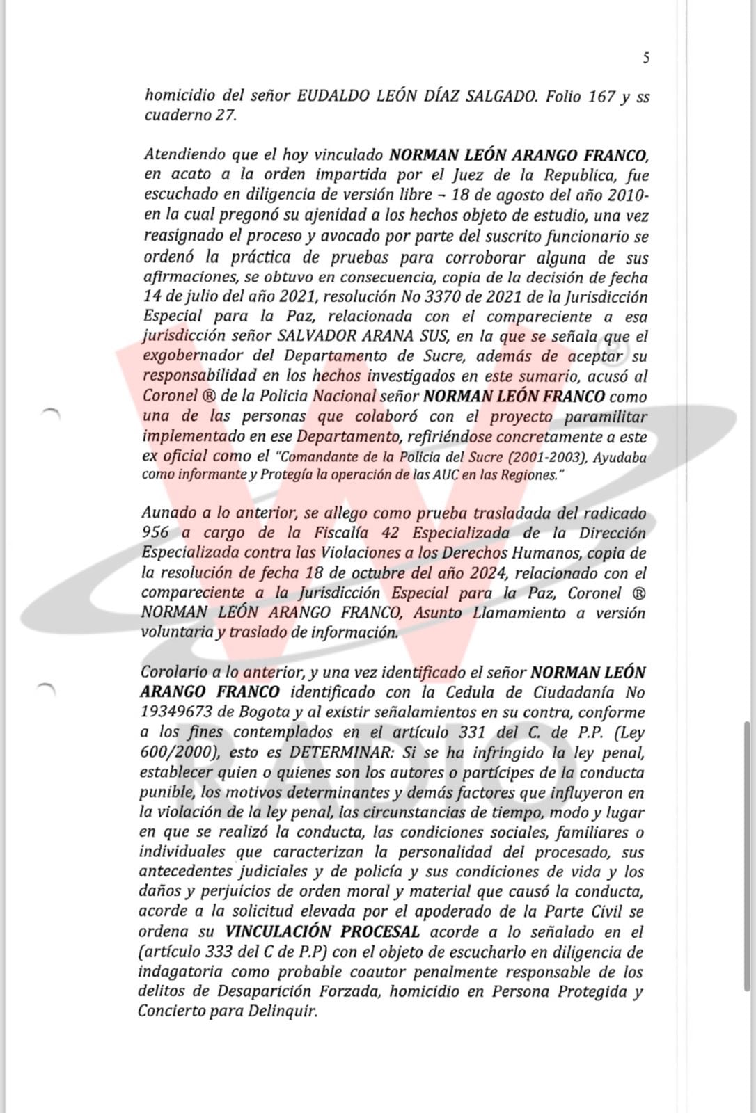 “Una vez identificado el señor NORMAN LEÓN ARANGO FRANCO y al existir señalamientos en su contra, esto es DETERMINAR: Si se ha infringido la ley penal, establecer quién o quiénes son los autores o partícipes de la conducta punible, los motivos determinantes y demás factores que influyeron en la violación de la ley penal, las circunstancias de tiempo, modo y lugar en que se realizó la conducta, las condiciones sociales, familiares o individuales que caracterizan la personalidad del procesado, sus antecedentes judiciales y de policía y sus condiciones de vida y los daños y perjuicios de orden moral y material que causó la conducta, acorde a la solicitud elevada por el apoderado de la Parte Civil se ordena su VINCULACIÓN PROCESAL acorde a lo señalado en el (artículo 333 del C de P.P) con el objeto de escucharlo en diligencia de indagatoria como probable coautor penalmente responsable de los delitos de Desaparición Forzada, homicidio en Persona Protegida y Concierto para Delinquir”, se lee en la decisión de la Fiscalía.