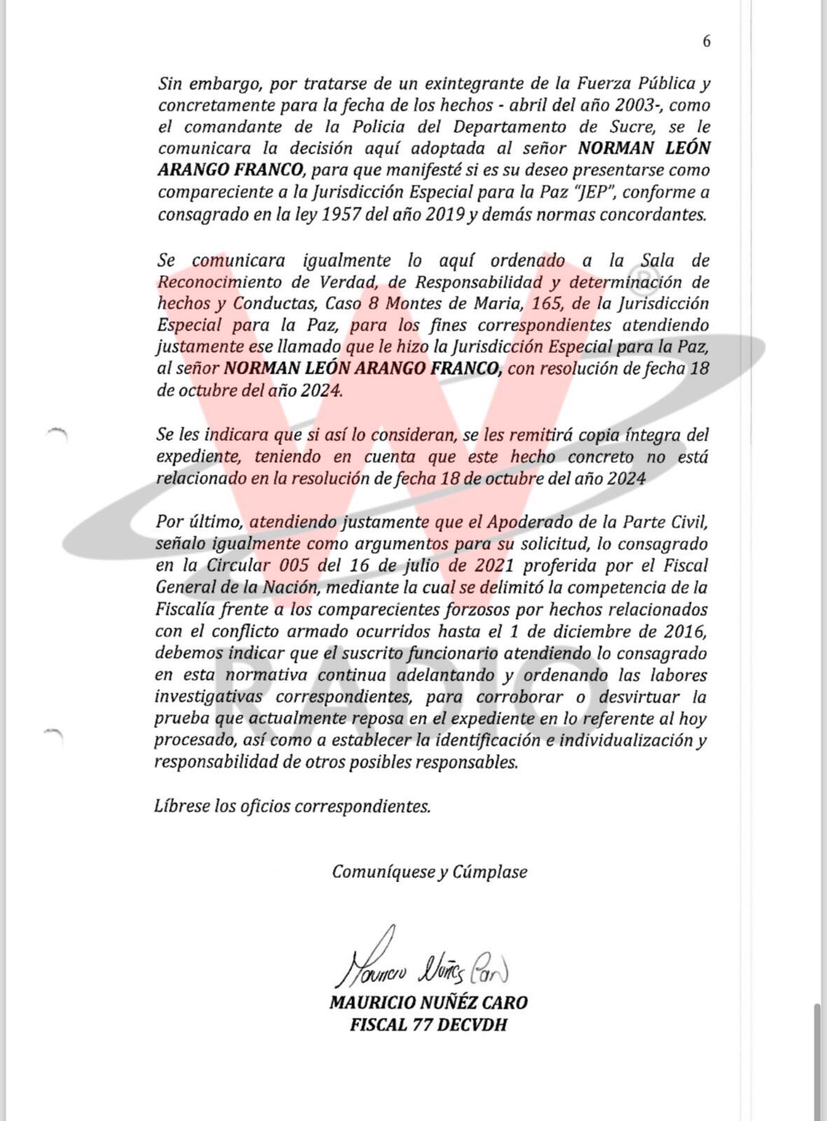 En un documento de seis páginas, el fiscal 77 de la Dirección Especializada contra las Violaciones de Derechos Humanos, Mauricio Núñez Caro, ordenó la vinculación procesal del coronel retirado por su presunta relación con el grupo paramilitar que perpetró el crimen.