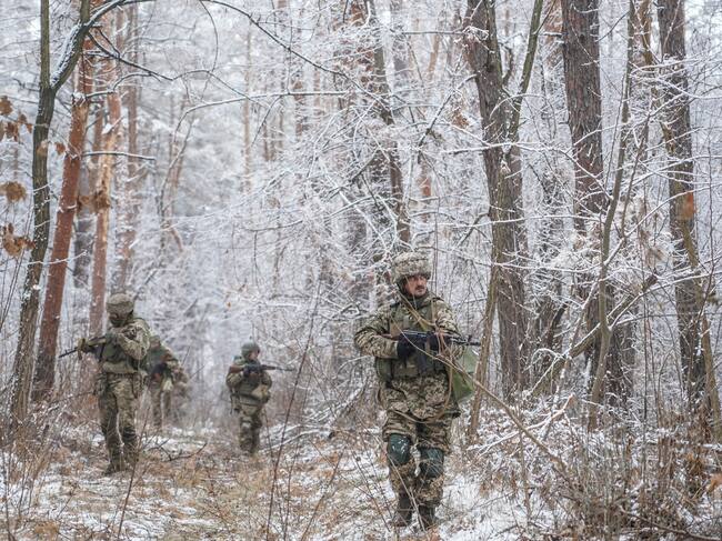 Dnipro (Ucrania), 13/01/2025.- Militares de la 33ª Brigada Mecanizada Separada aprendiendo a patrullar y a camuflarse en el bosque como parte de su entrenamiento. / 33rd Separate Mechanized Brigade (EFE)