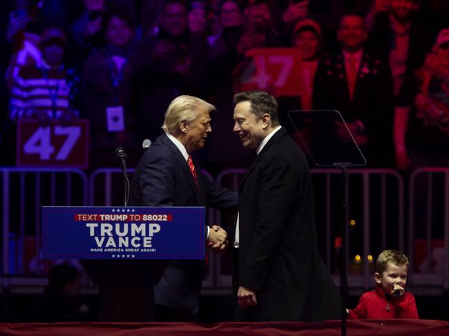 WASHINGTON (ESTADOS UNIDOS), 19/01/2025.- El presidente electo de Estados Unidos, Donald Trump (i), saluda a Elon Musk en el estadio Capital One Arena. / Angel Colmenares (EFE)