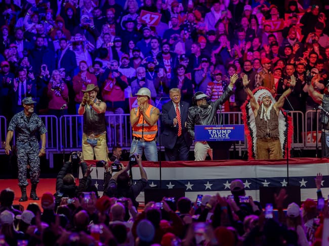 El mitin cerró con Trump en el escenario bailando y cantando “Y.M.C.A.” junto a Village People, cuyos integrantes lucieron sus emblemáticos disfraces de vaquero, obrero, motociclista, policía y jefe indígena, en un espectáculo vibrante que hizo que muchos de los asistentes se pusieran a bailar.