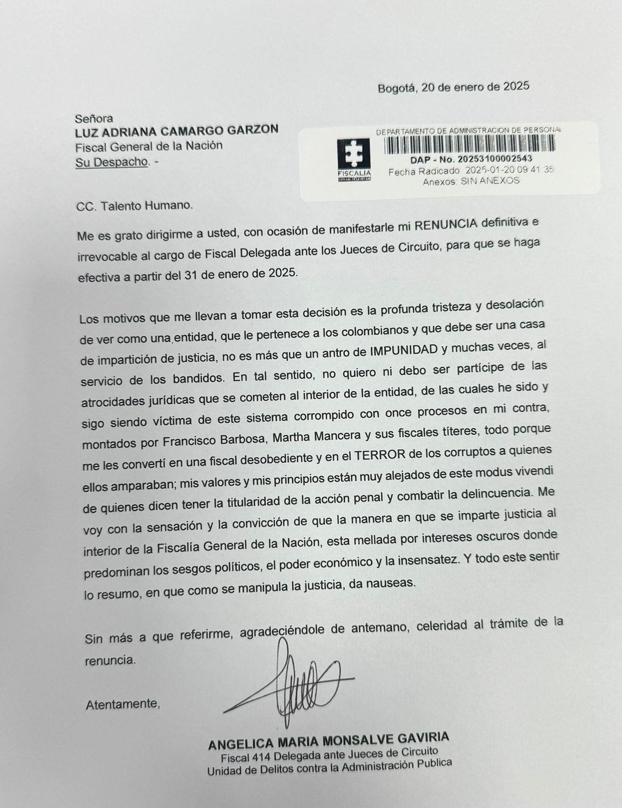 La fiscal Angélica Monsalve le envió a la fiscal general de la Nación, Luz Adriana Camargo, su carta de renuncia irrevocable, por considerar que existe una persecución judicial en su contra.