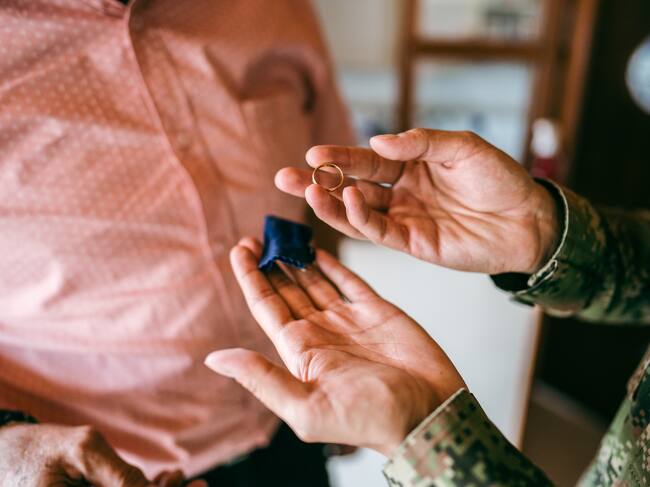 Primer plano de un soldado sosteniendo un anillo de bodas. Getty Images / Frazao Studio Latino