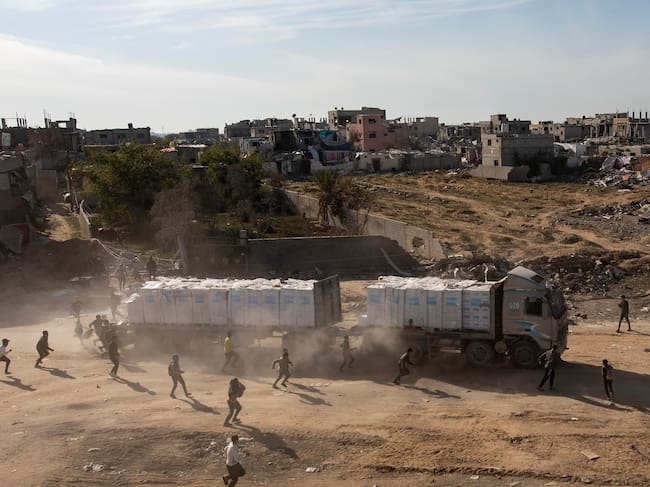 Camíon de ayuda en Gaza en medio del alto el fuego. FOTO: EFE/ Haitham Imad / HAITHAM IMAD (EFE)