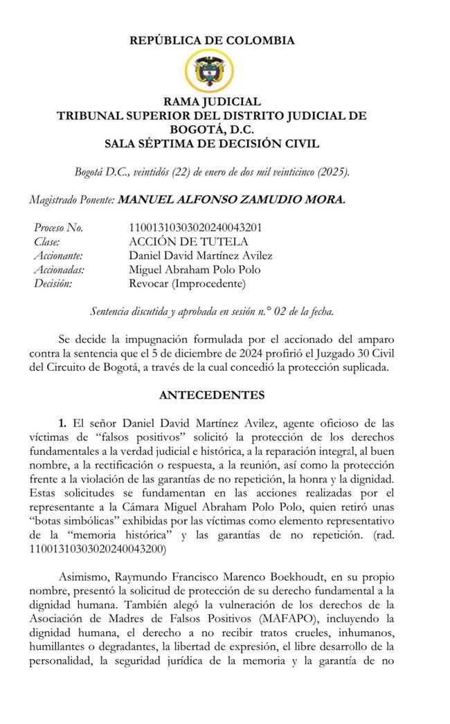 El Tribunal Superior del Distrito Judicial de Bogotá revocó el fallo proferido el 5 de diciembre de 2024 por el Juzgado 30 Civil del Circuito, que otorgaba amparo a los derechos fundamentales de las víctimas de ejecuciones extrajudiciales conocidas como “falsos positivos”.