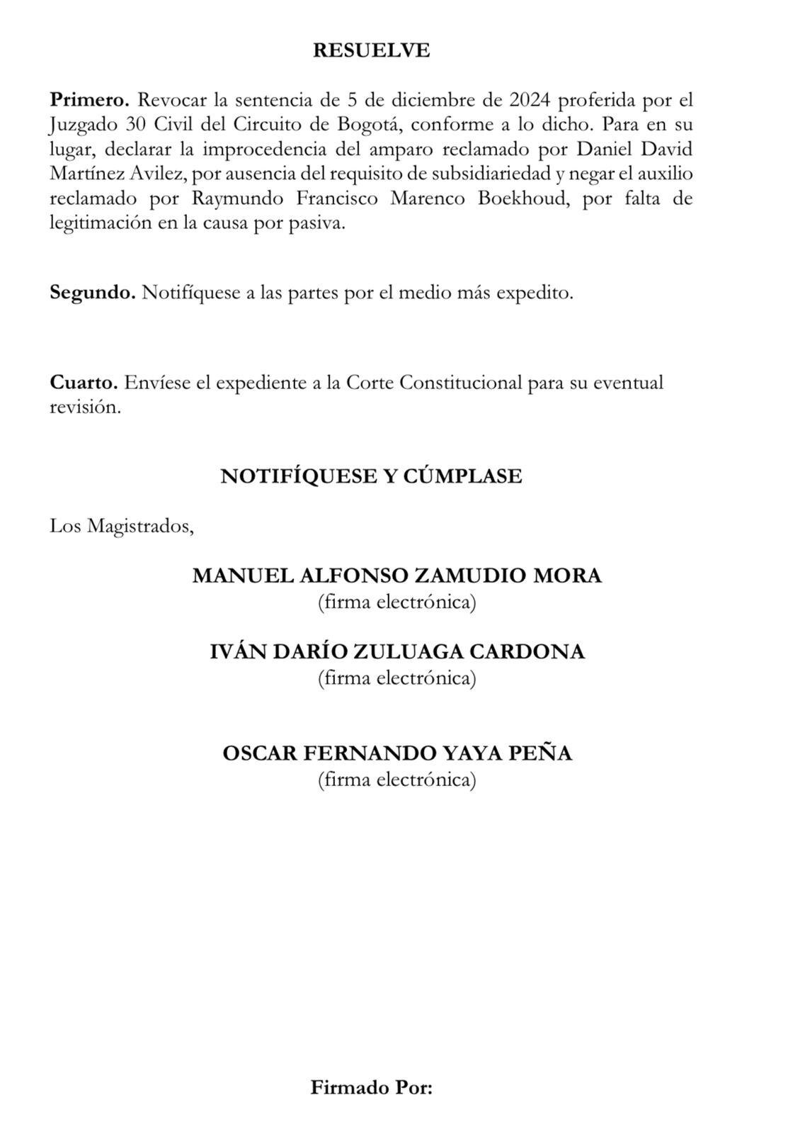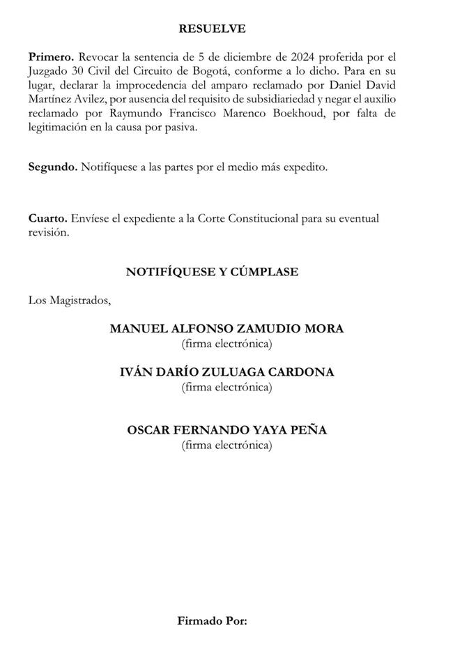El Tribunal resolvió “revocar la sentencia de 5 de diciembre de 2024” y, en su lugar, “declarar la improcedencia del amparo reclamado por Daniel David Martínez Avilez y negar el auxilio solicitado por Raymundo Francisco Marenco Boekhoudt”. Asimismo, ordenó remitir el expediente a la Corte Constitucional para su eventual revisión.