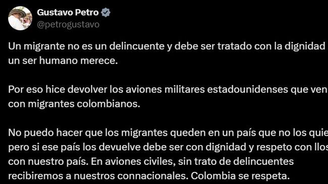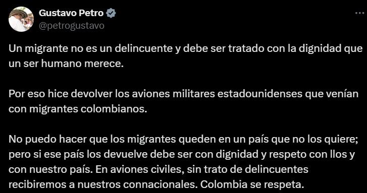 “Un migrante no es un delincuente y debe ser tratado con la dignidad que un ser humano merece. Por eso hice devolver los aviones militares estadounidenses que venían con migrantes colombianos”, agregó el presidente Gustavo Petro en otro trino.
