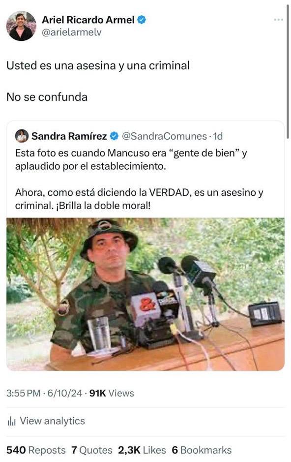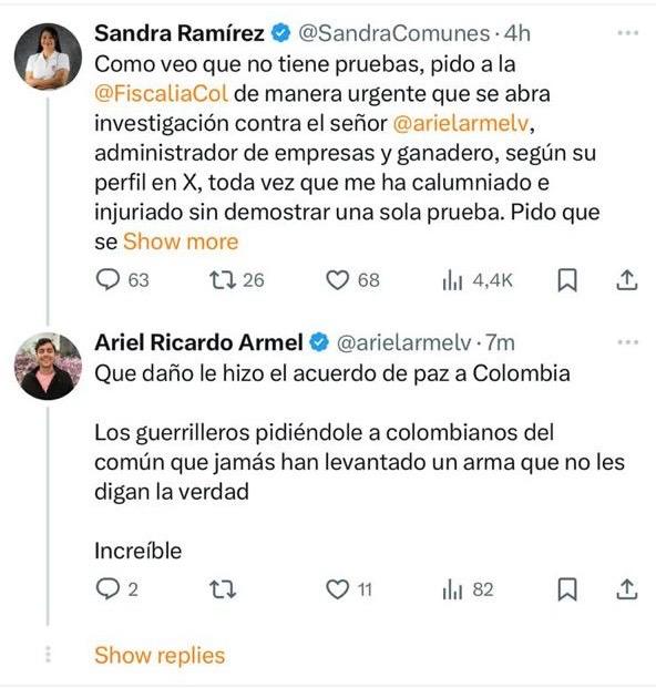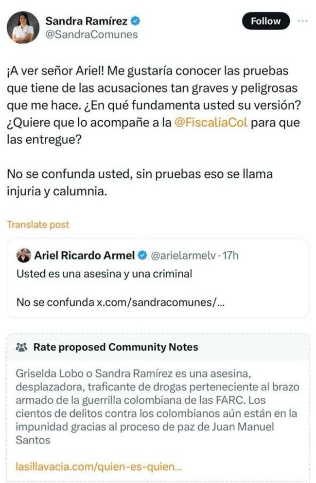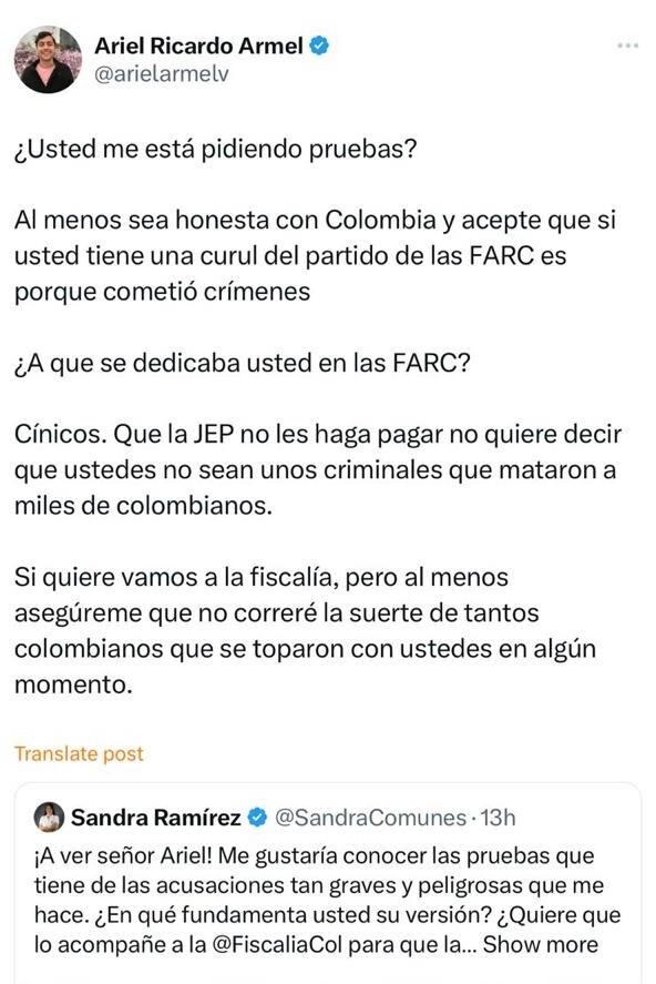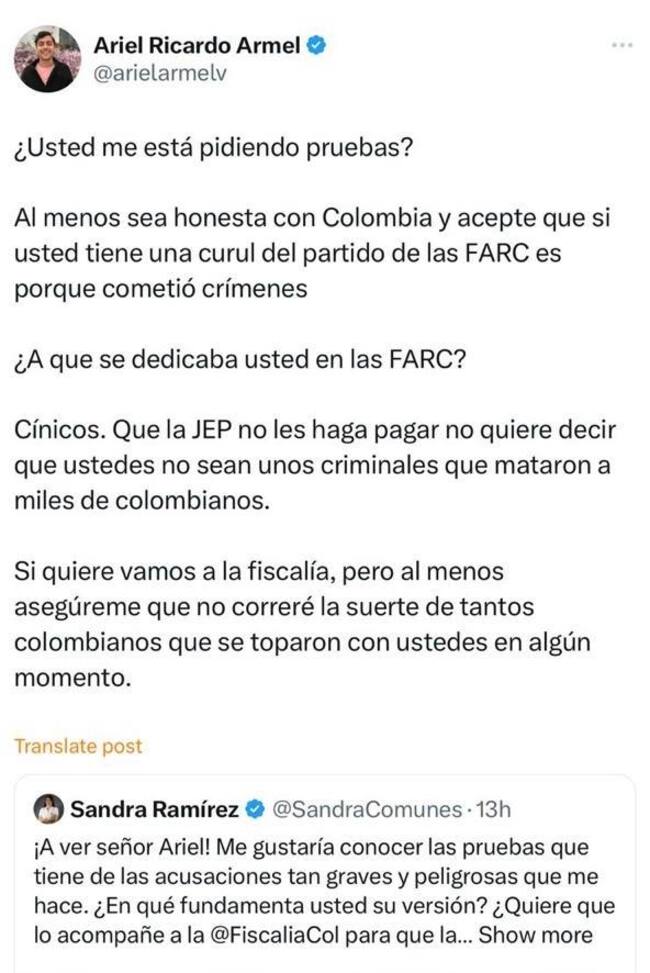 En diferentes publicaciones, hechas en la red social de ‘X’, Armel Vásquez calificó de “asesina y criminal” a la congresista que respondió a las manifestaciones diciendo: “¡A ver, señor Ariel! Me gustaría conocer las pruebas que tiene de las acusaciones tan graves y peligrosas que me hace. ¿En qué fundamenta usted su versión? ¿Quiere que lo acompañe a la Fiscalía General de la Nación para que las entregue? No se confunda usted, sin pruebas eso se llama injuria y calumnia”.