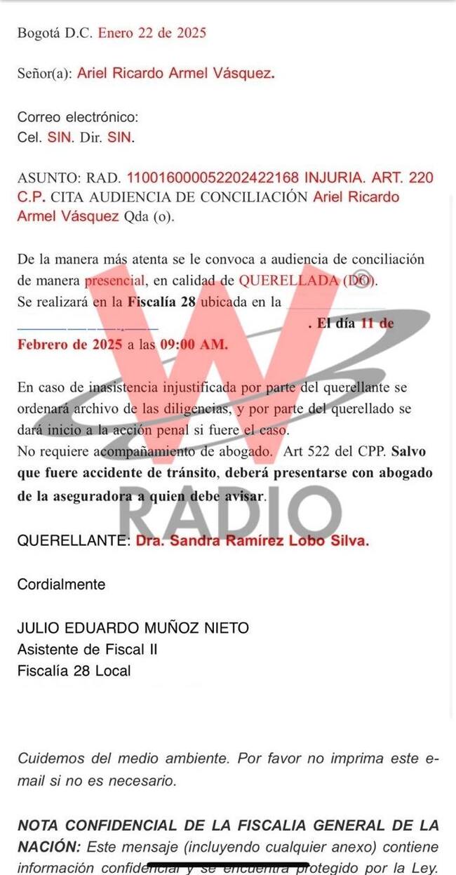 W Radio habló con el activista político que señaló que acudirá a la audiencia de conciliación en compañía de su abogado defensor, el penalista Juan Camilo Brito Larsen.