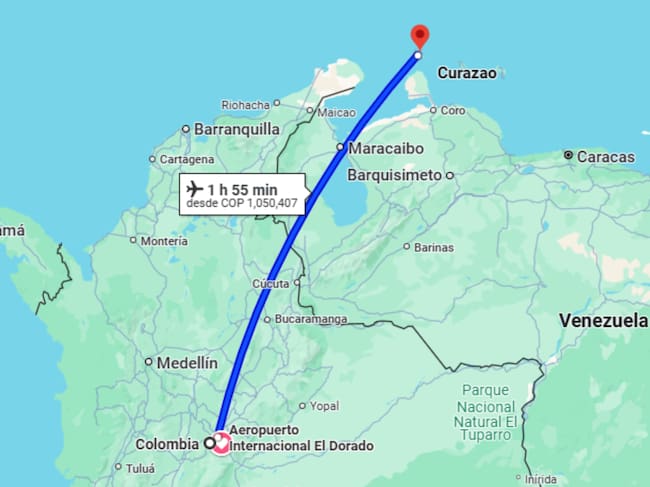 Según Google Maps, un vuelo desde Bogotá hasta Aruba tardaría solo 1 hora y 55 minutos, mucho menos que varios viajes por tierra en Colombia.